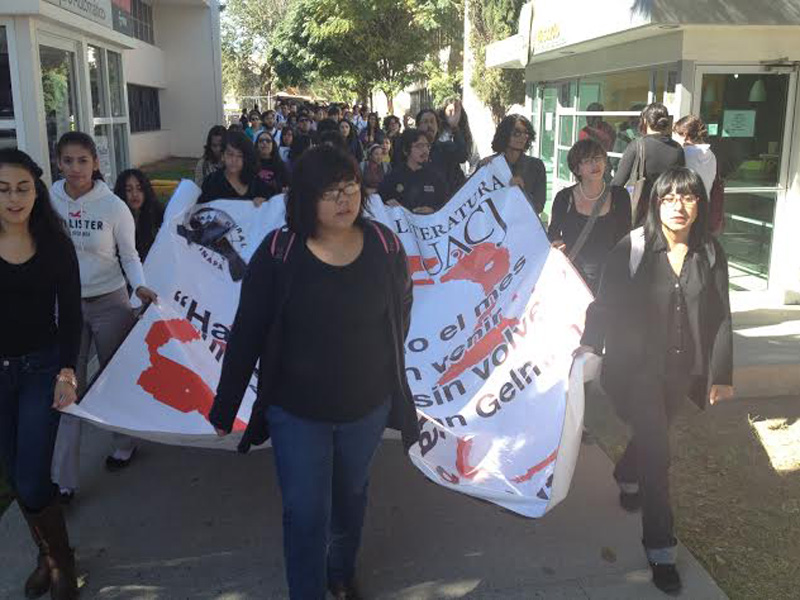 Estudiantes de la UACJ y otros planteles que marcharon hace unos momentos de ICSA a IADA, solicitaron al rector de ja UACJ, Ricardo Duarte, se una a la manifestación del paro nacional propuesto por normalistas de Guerrero.