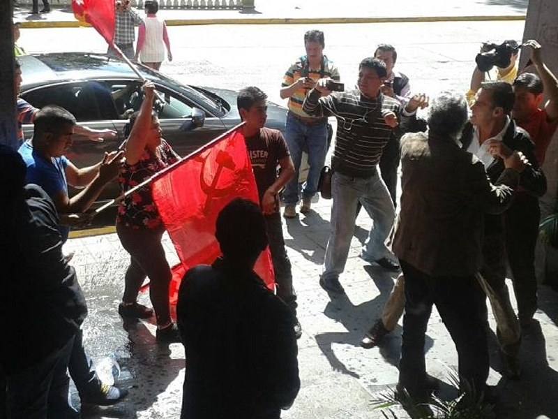un grupo de personas que portaban carteles y banderas con las siglas del Frente Popular Revolucionario (FPR), quienes le gritaron "asesino" al senador y luego le pegaron con unas varas en las que portaban sus cartelones de protesta.