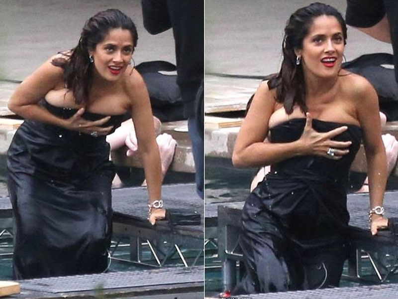 Hayek posó en una piscina y al salir tuvo que sostener el vestido a la altura del escote para evitar que sus senos quedaran al descubierto