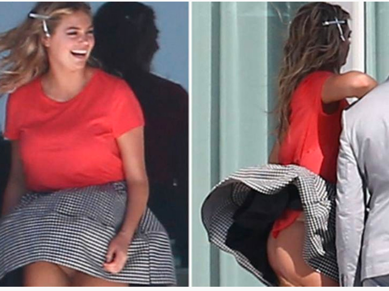 Kate Upton, una de las famosas víctimas del "celebgate", ahora sufrió a causa del viento, que le levantó la falda.