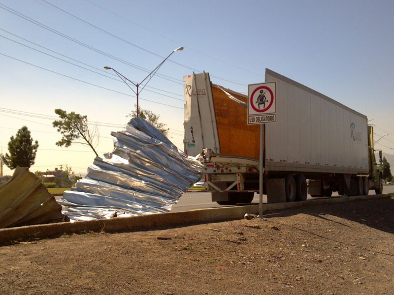 La parte de arriba de la caja del camión se desprendió y quedó en el piso hecha un acordeón