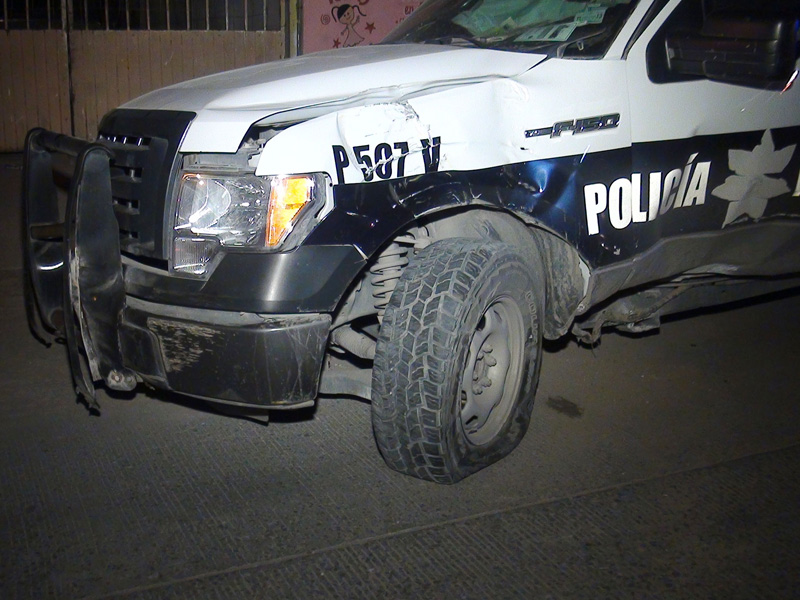 Una alcantarilla abierta provocó la noche del miércoles que dos agentes de la Policía Municipal resultaron lesionados tras caer en dicho hoyo y estrellar la unidad contra un poste de una compañía de teléfonos.