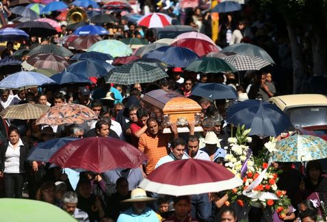 Tras misa cortejo fúnebre partió hacia el cementerio; un féretro fue recibido con cohetones, 'porque aquí, así recibimos a nuestros muertos'