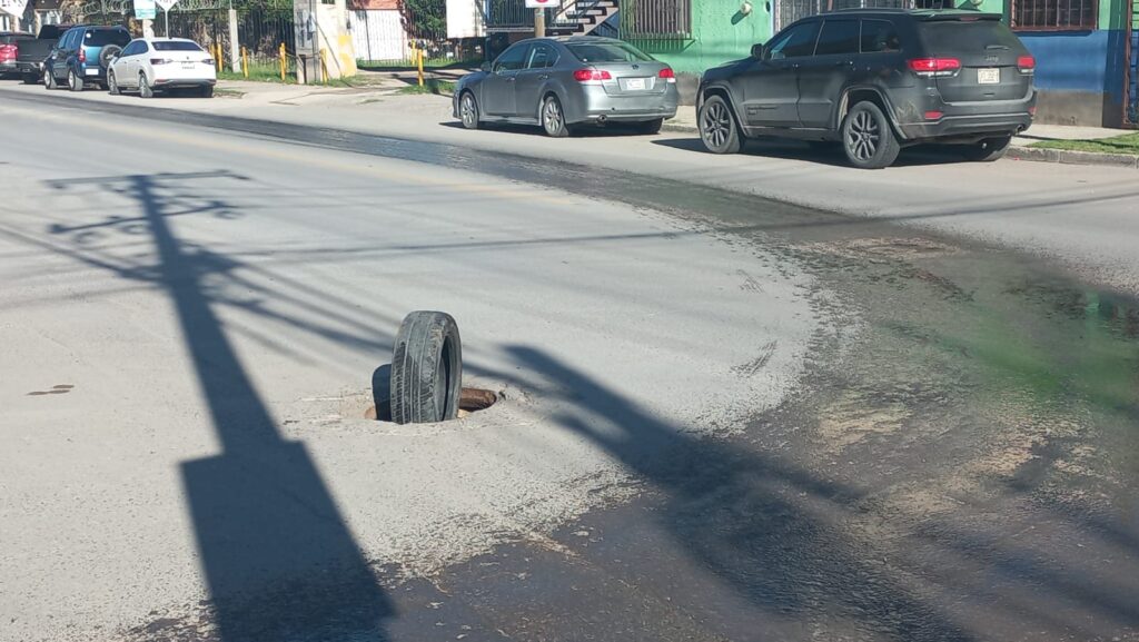 Sin embargo, en la misma vialidad permanece una alcantarilla sin tapa y “señalada” con una llanta, justo en la entrada del fraccionamiento Jardines del Seminario.