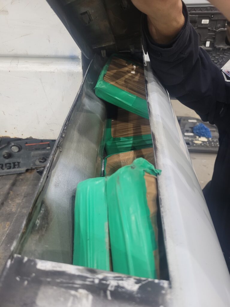 Un perro adiestrado —entrenado para detectar narcóticos ocultos y personas escondidas— indicó la presencia de narcóticos en el vehículo. Tras una inspección adicional, se descubrieron 122 paquetes de narcóticos. Estos incluyen: