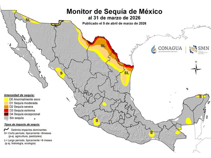 De acuerdo con el Monitor de Sequía del Servicio Meteorológico Nacional (SMN), al 31 de marzo de este año solo el municipio de Manuel Benavides, ubicado al noreste de la entidad, se encuentra en esa condición, la más grave entre las clasificaciones que aplica la dependencia.