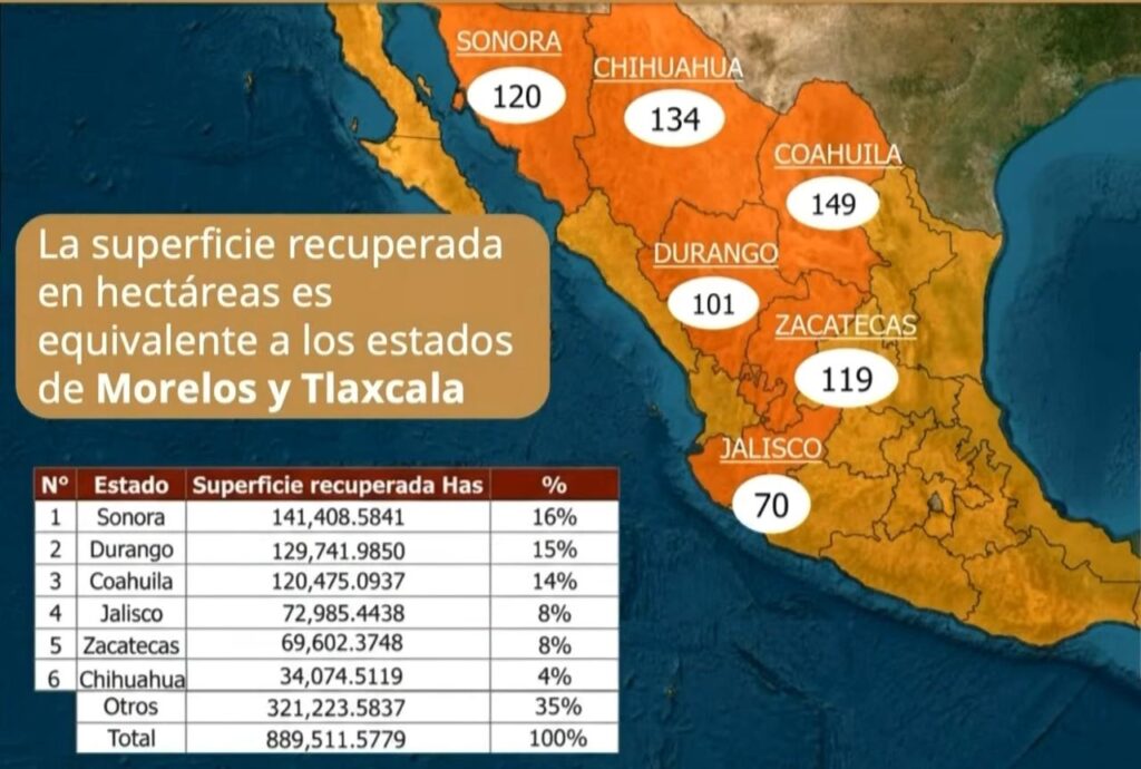 El desglose por número de concesiones recuperadas coloca a Chihuahua en el segundo lugar con 134 concesiones canceladas, estas abarcan aproximadamente 34,074 hectáreas, representando el 4% del total nacional recuperado.