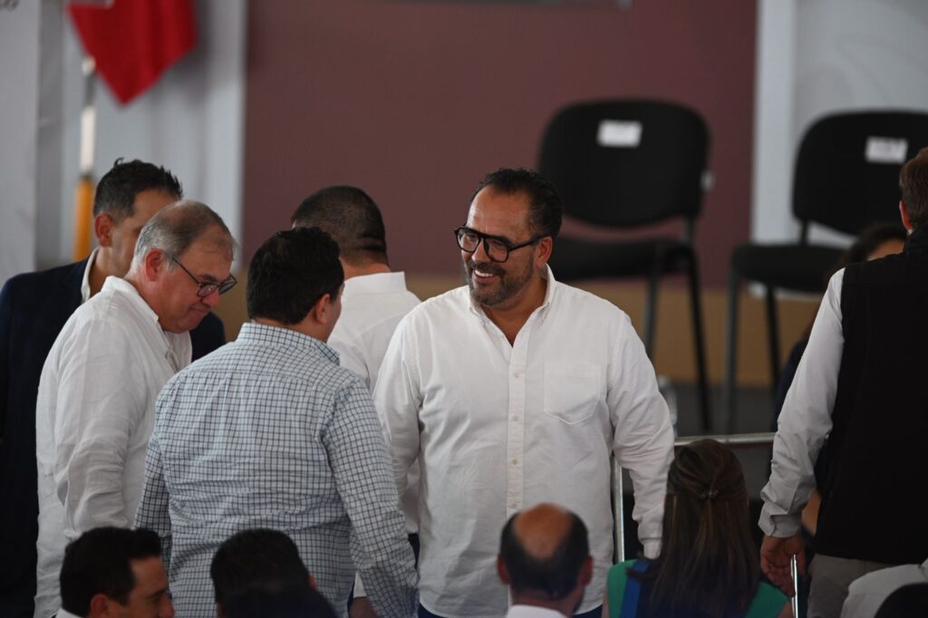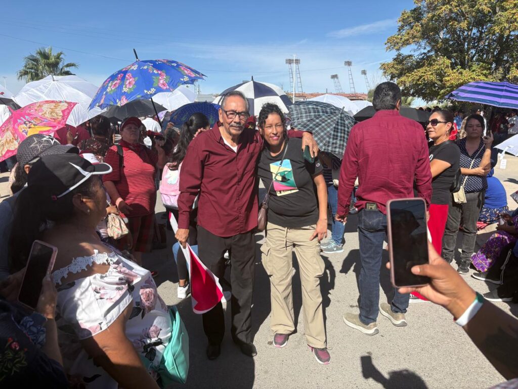 Líderes de la antigua estructura priista, encabezada por César Tapia, también se encuentran al frente de algunos de los contingentes que arriban al estadio, marcando presencia en la movilización.