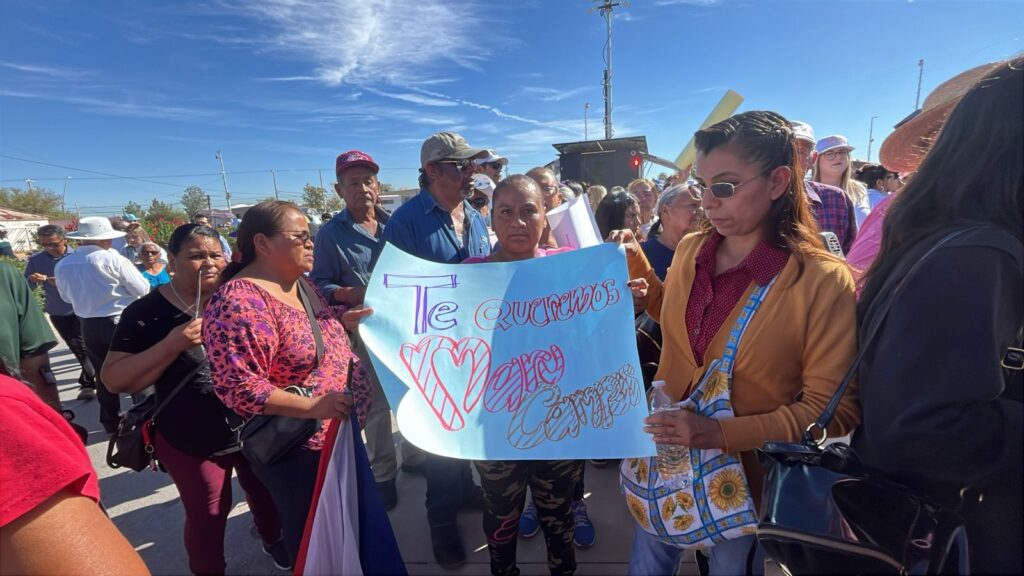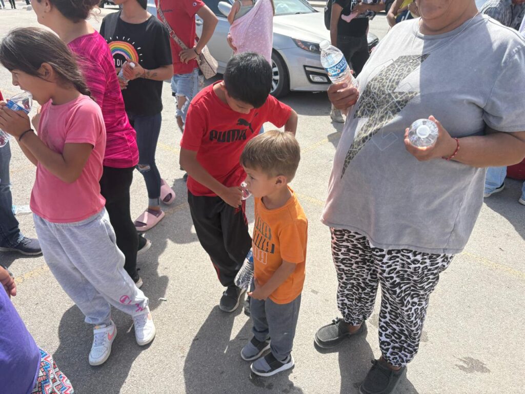 Familias procedentes de Janos, que viajaron cinco horas para asistir al evento, fueron recibidas con la noticia de que no podrían ver a la presidenta. Les dieron una botella de agua caliente, mientras buscaban al líder que las organizó para coordinar el regreso con sus niños.