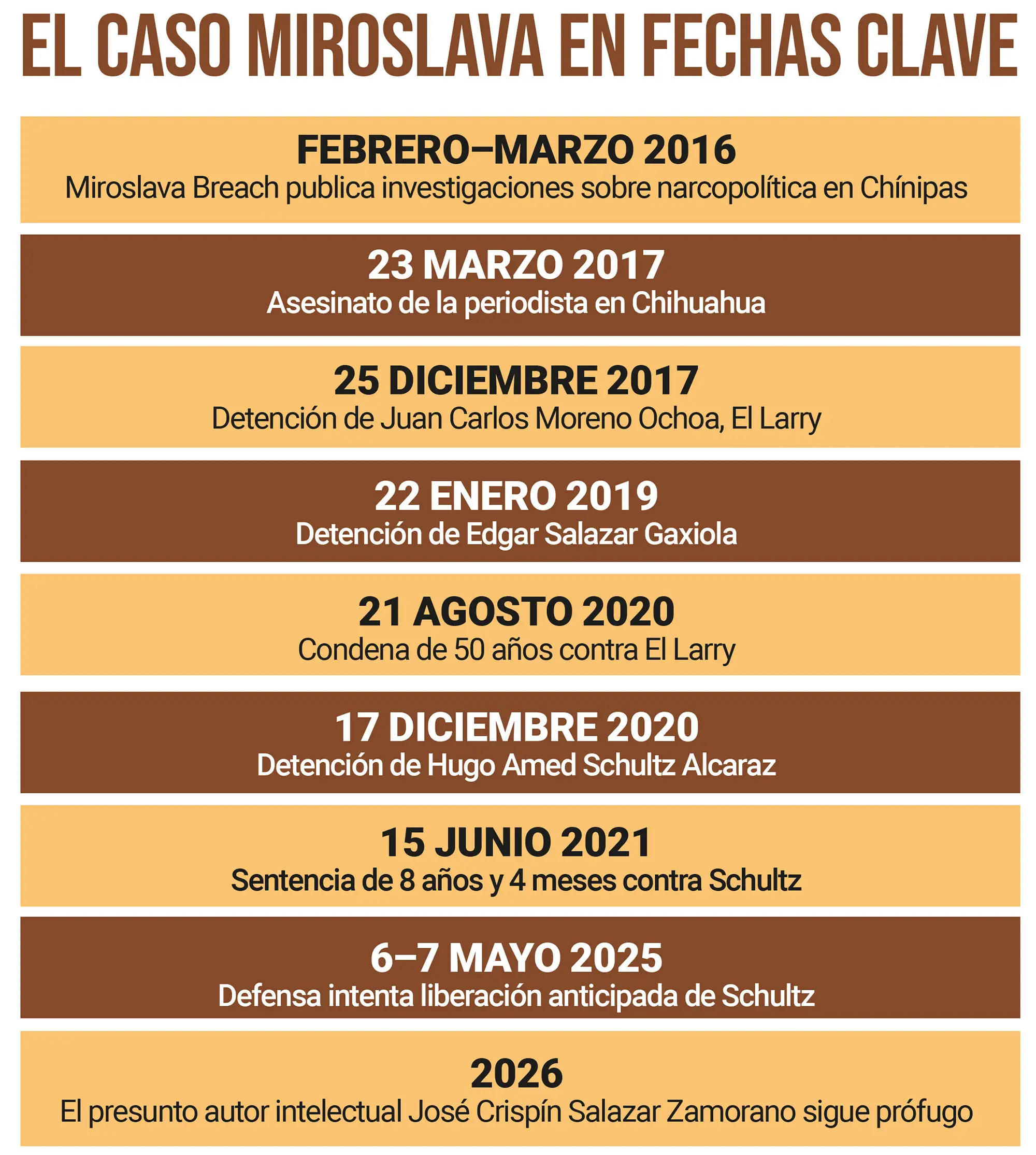Poco más de tres meses después, el 17 de diciembre de 2020, fue detenido Hugo Amed Schultz Alcaraz, el exalcalde panista de Chínipas, amigo de José Crispín, acusado de ser cómplice auxiliador en el asesinato de la periodista.
