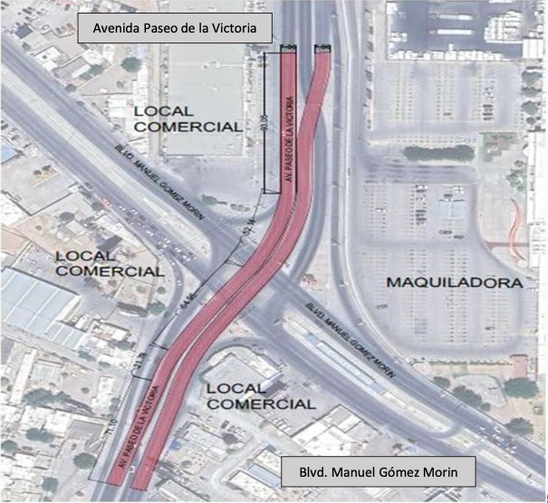 Se elevará el Paseo de la Victoria sobre el bulevar Teófilo Borunda. Tendrá una longitud aproximada de 220 metros y 9 metros de ancho en cada sentido. Se construirá un puente elevado a base de concreto reforzado, con apoyos intermedios (pilas) y cimentación profunda acorde a las condiciones del suelo de la zona.