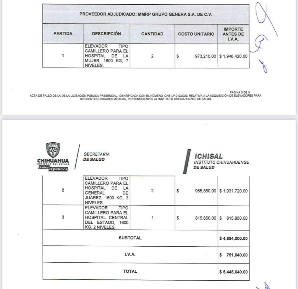 La empresa a la que le fueron adjudicadas cada una de las partidas esta identificada como MMRP Grupo Genera S.A. de C.V., con oficinas en Chihuahua.