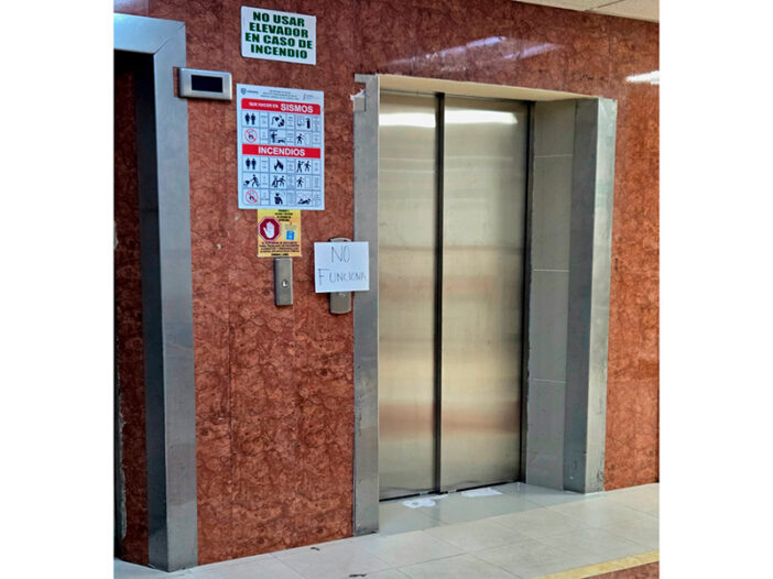 A un lado de la puerta de uno de los elevadores que está en el segundo piso, se observa un rótulo escrito a mano en una hoja blanca que dice: “No funciona”.