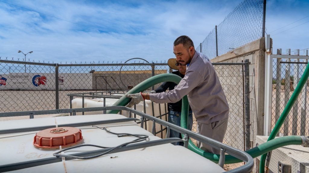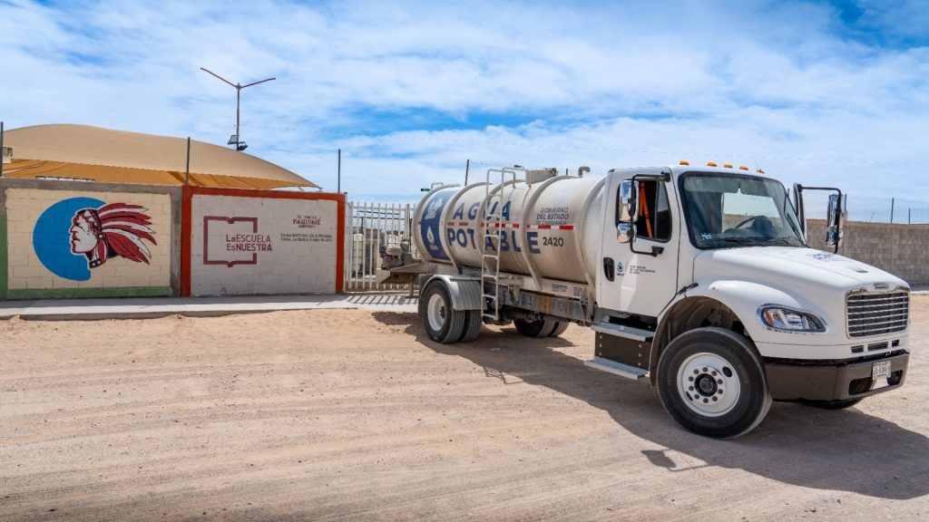 La Junta Municipal de Agua y Saneamiento de Juárez (JMAS) mantiene el suministro de agua potable en pipas a escuelas ubicadas en Los Kilómetros, donde el acceso al servicio es limitado.