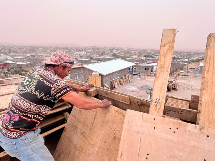 “Con los fuertes vientos se mueve el jacal muy feo y entra toda la tierra, por eso le hice así para tapar poquito el aire”, explicó el hombre después de asegurar con cuñas de madera algunas tablas que estaban siendo movidas por el viento.
