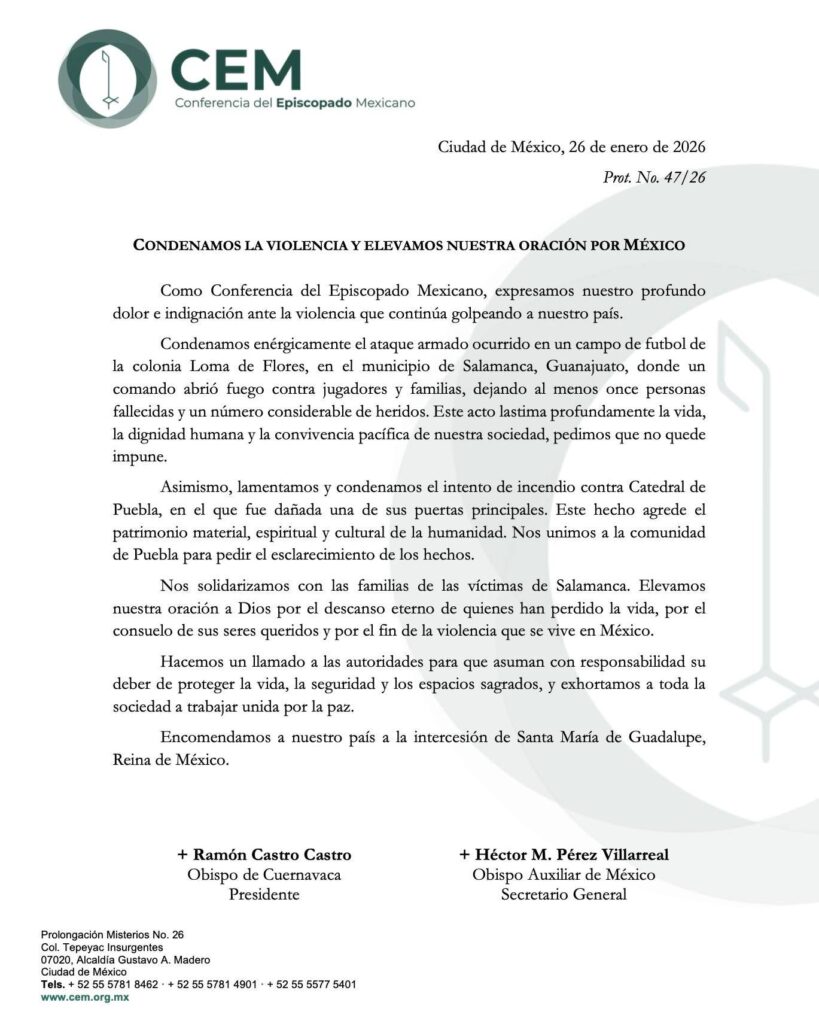 La Conferencia del Episcopado Mexicano (CEM), condenó este lunes la masacre en la que al menos 11 personas perdieron la vida y otras 12 resultaron lesionadas, luego de que un comando armado irrumpiera y abriera fuego, durante un partido de futbol en Salamanca, Guanajuanto.