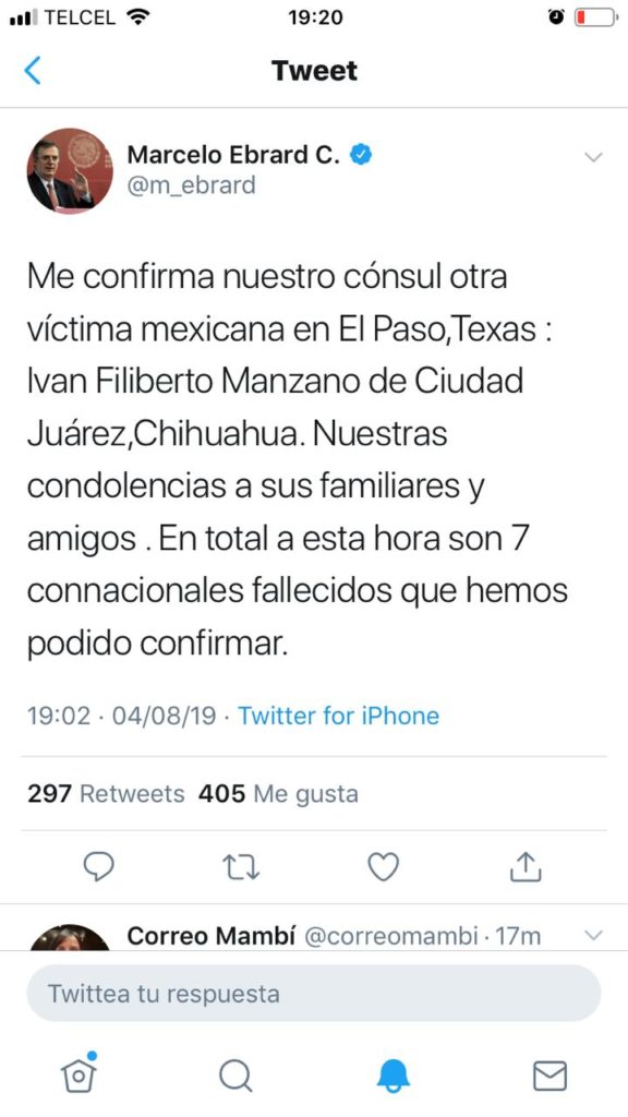 El canciller mexicano, Marcelo Ebrard, confirmó este día la víctima mortal número 7 del tiroteo registrado el sábado en un supermercado de El Paso.