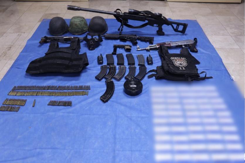 En el lugar fueron aseguradas cuatro armas largas y una corta, 50 tarjetas telefónicas, ocho cargadores de diversos calibres, una cámara de video y cartuchos útiles de diversos calibres, además de equipo táctico., incluido un chaleco antibalas color negro con un parche de un tigre y la leyenda “Gente del 11”.