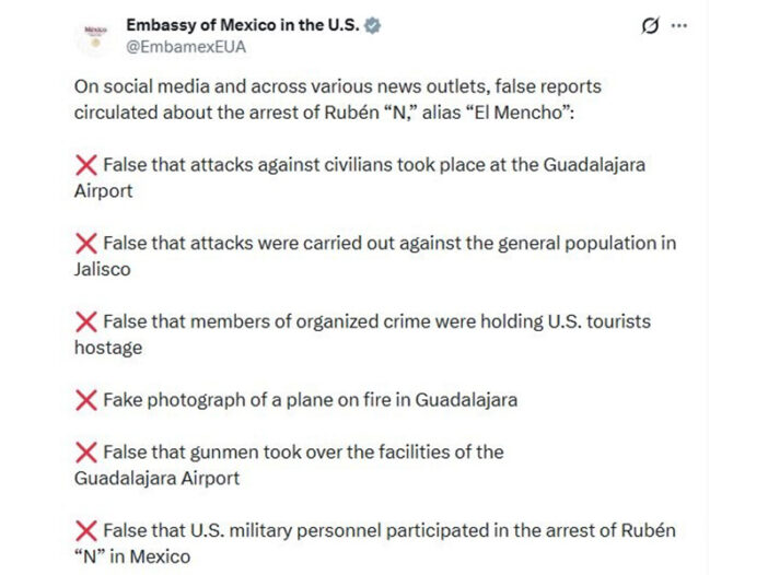 A través de un mensaje replicado por la Embajada de México en EU, se desmintieron versiones que aseguraban ataques contra civiles en el Aeropuerto de Guadalajara, agresiones generalizadas a la población en Jalisco, retención de turistas estadounidenses, así como la supuesta participación de personal militar de Estados Unidos en operativos en México.