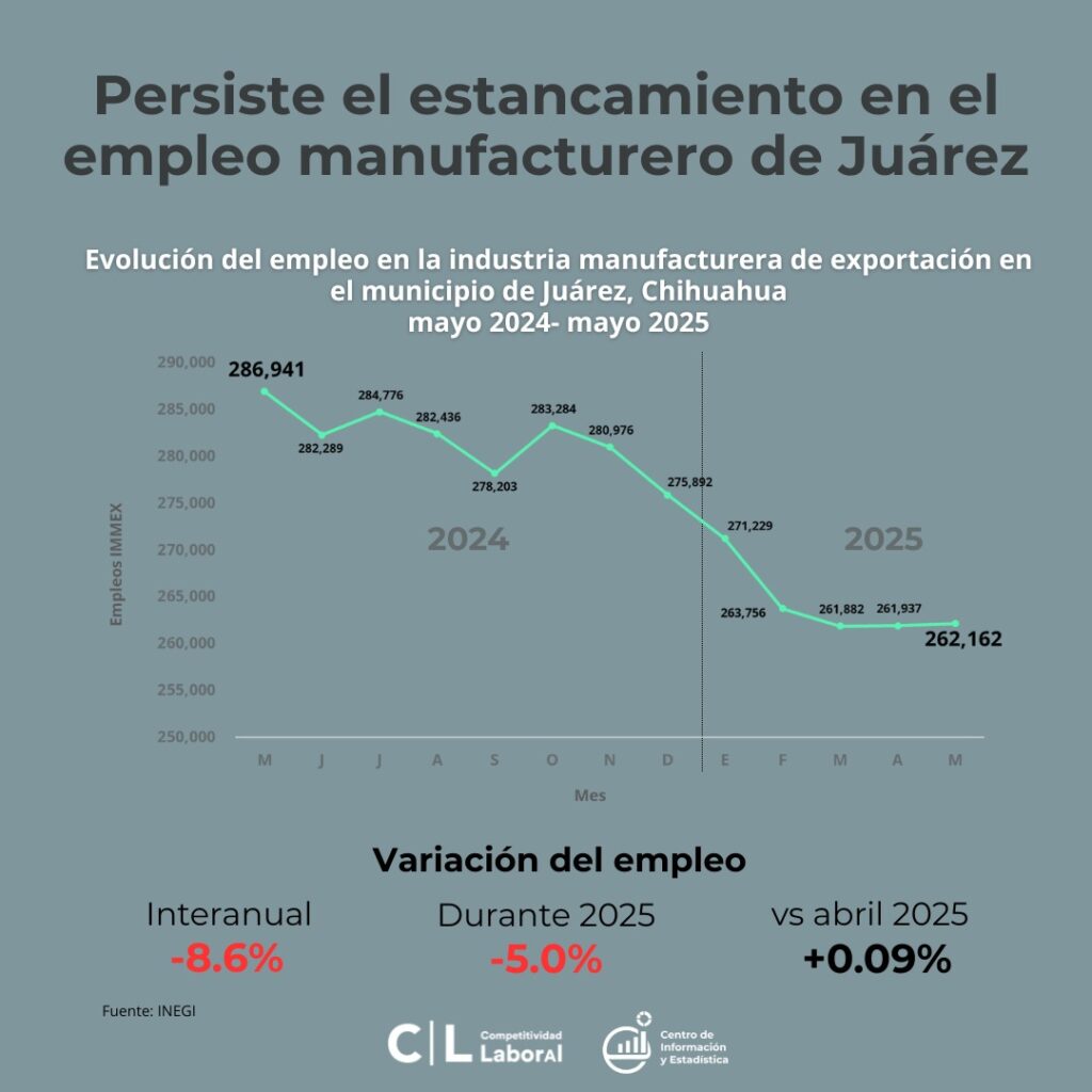 Solo de diciembre de 2024 a mayo de 2025, la industria que mueve a Juárez perdió 13 mil 730 puestos de trabajo por lo que la recuperación sigue siendo insuficiente.