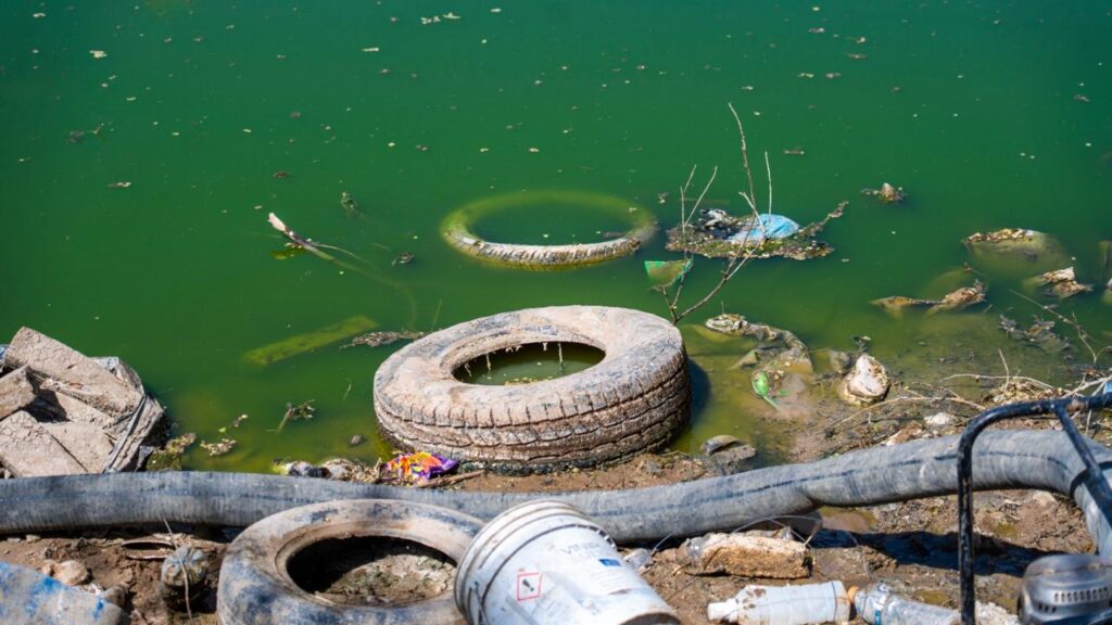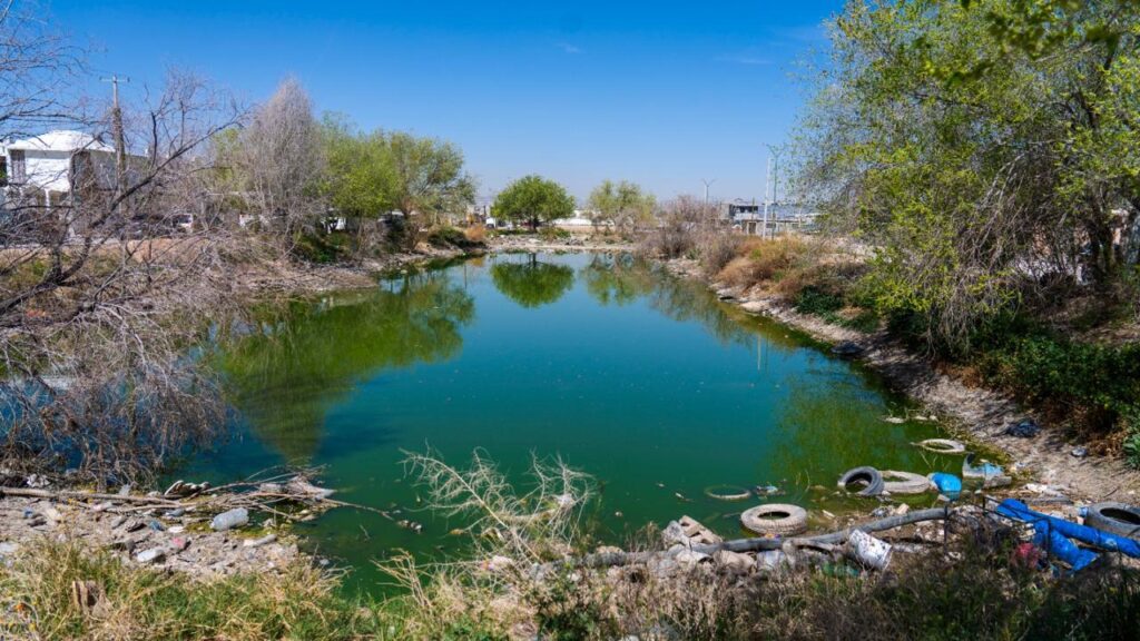 Basura doméstica, plásticos, grasas y llantas de desecho convirtieron el dique del fraccionamiento El Mezquital en un muladar, hecho que fue denunciado ante la Junta Municipal de Agua y Saneamiento (JMAS) por habitantes del sector, quienes solicitaron apoyo para labores de limpieza.