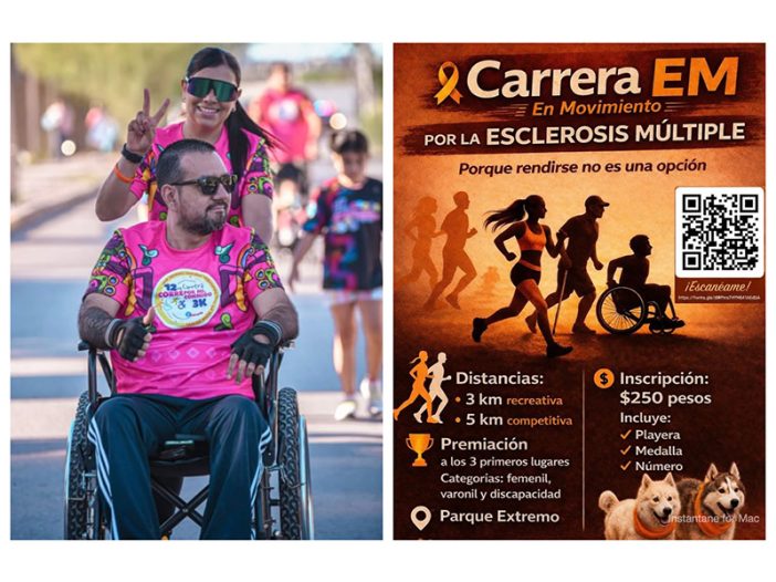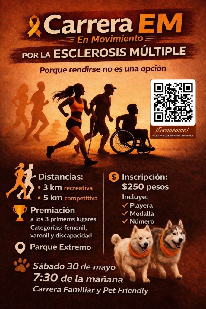 Con el nombre de EM En Movimiento, pacientes con esclerosis múltiple invitan a los juarenses a una carrera que se llevará a cabo el sábado 30 de mayo a las 7:30 de la mañana en el Parque Extremo, con la finalidad de concientizar sobre esta enfermedad autoinmune que afecta al cerebro y la médula espinal.
