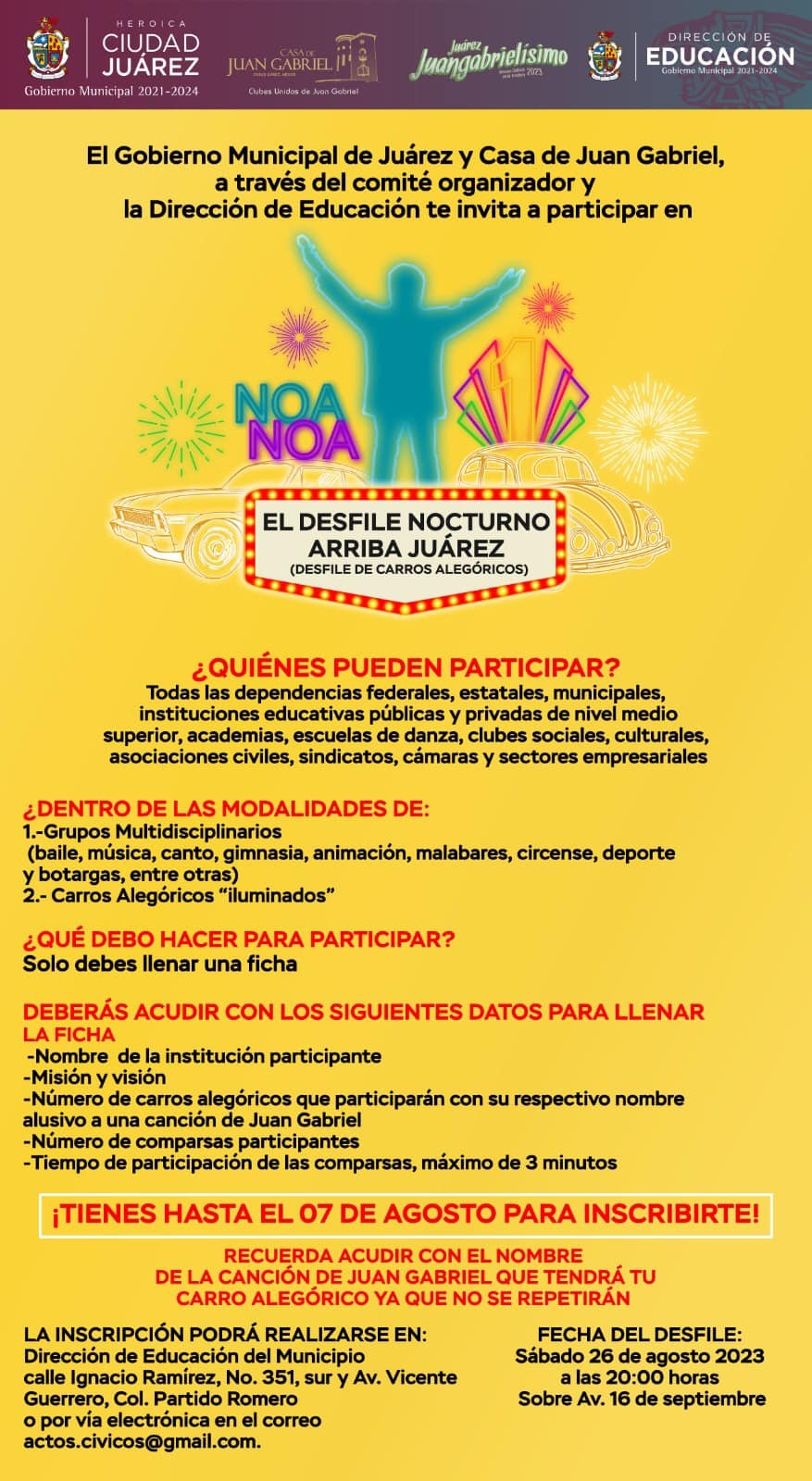 El Gobierno Municipal por medio de la Dirección de Educación Municipal convocó a la ciudadanía a participar en «El Desfile Nocturno Arriba Juárez», que se llevará a cabo el próximo 26 de agosto en homenaje al cantautor Juan Gabriel, se infiormó este día a través de un comunicado de prensa.