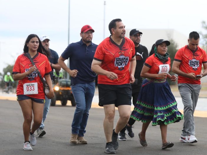 El presidencial municipal Cruz Pérez Cuéllar participó en la carrera pedestre Solana Norte Pies Ligeros la mañana de este domingo, para acompañar a la corredora rarámuri Lorena Ramírez.