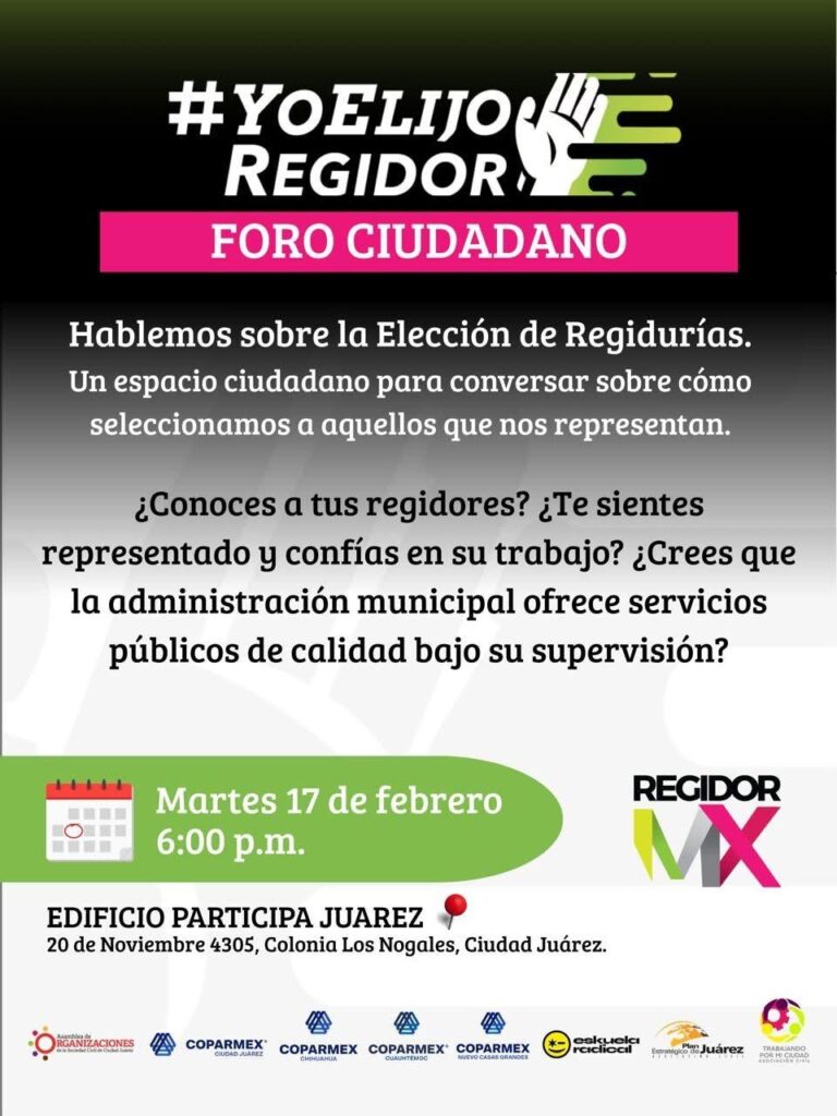 Este martes 17 de febrero se llevará a cabo el Foro Ciudadano Yo Elijo Regidor, convocado por Regidor MX y diversas organizaciones civiles, a partir de las 18:00 horas en el edificio Participa, ubicado en la avenida 20 de Noviembre 4305, en la colonia Los Nogales.