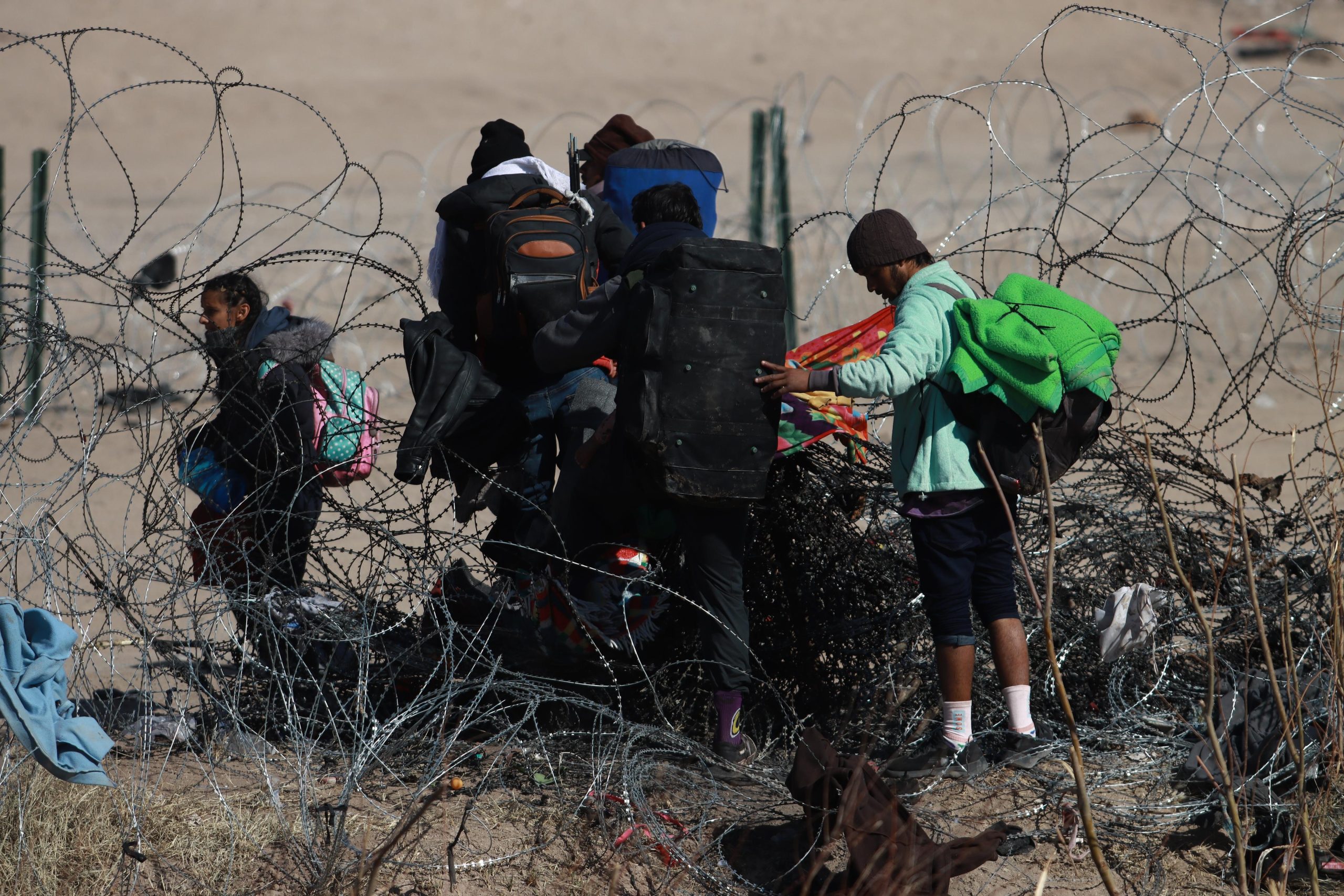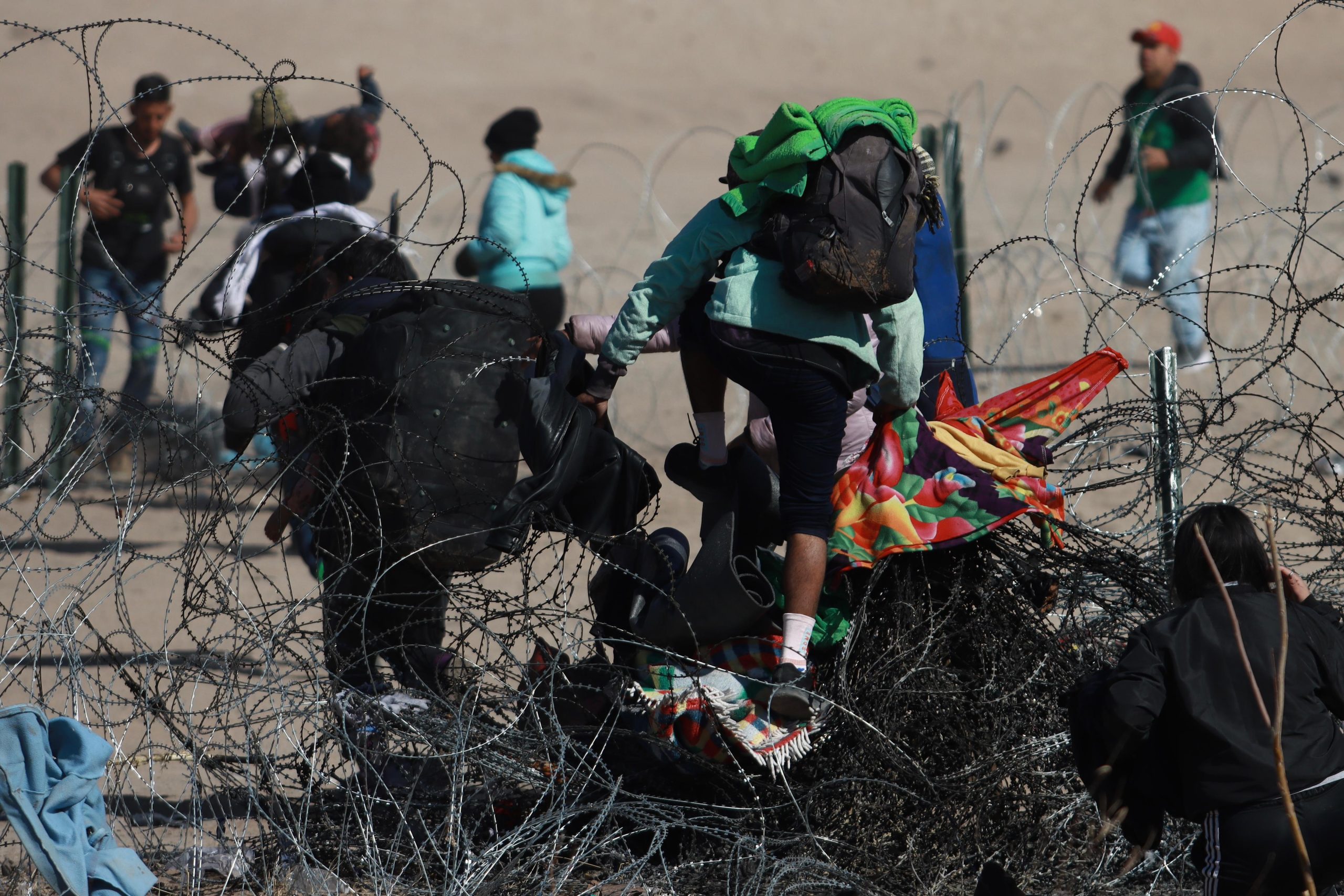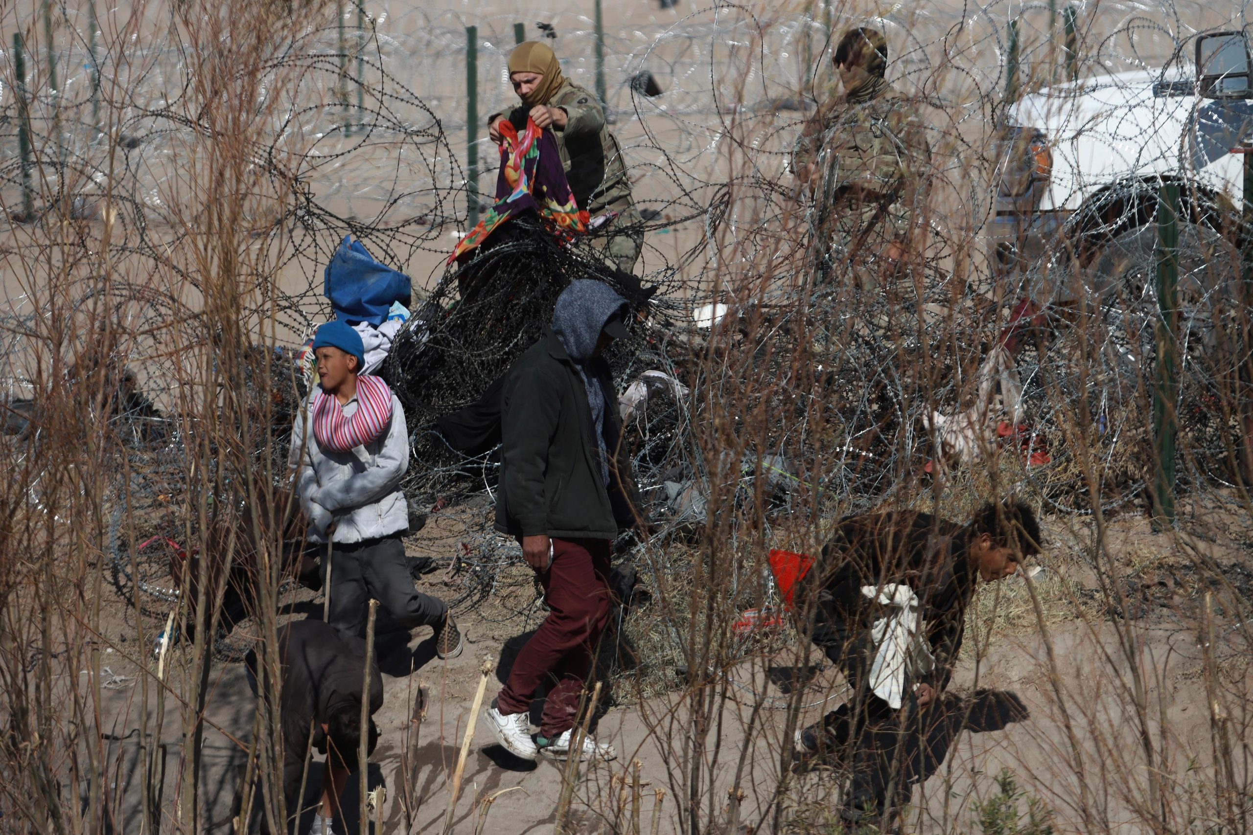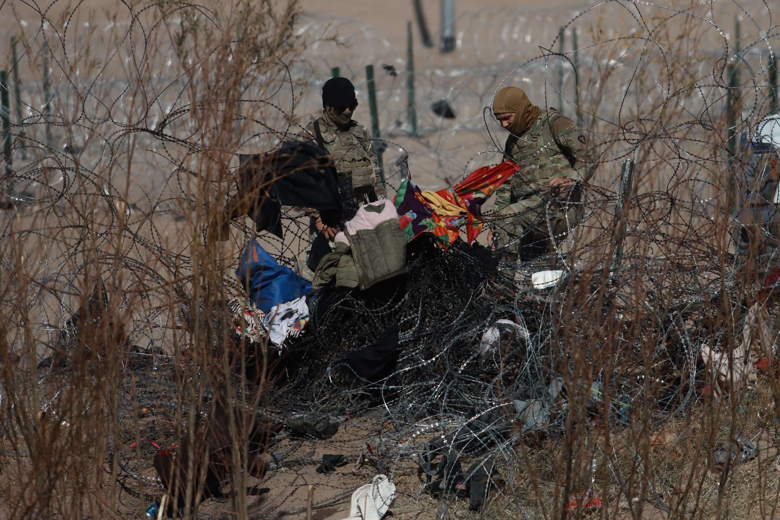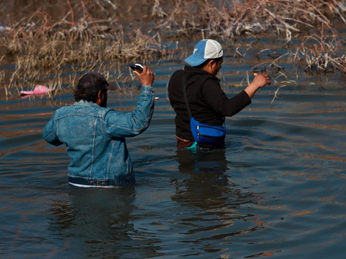 Las imágenes muestran a varias personas cruzando el río, mientras llevan en hombros a menores o cargan celulares para protegerlos del agua, y una vez que están en tierra estadounidense, esperan un descuido de los elementos de la Guardia Nacional de Texas para cruzar la malla cubierta con puás y navajas.