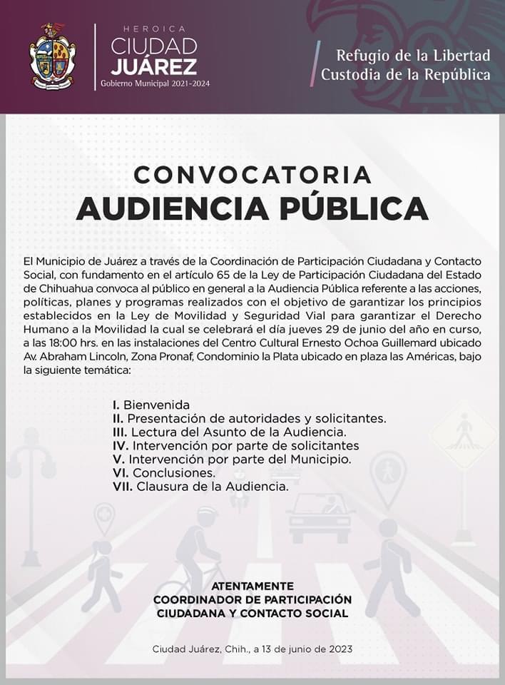 El Gobierno Municipal, a través del titular de la Dirección de Participación Ciudadana, Sebastián Aguilera, convocó a los juarenses a la Audiencia Pública que se llevará a cabo el próximo 29 de junio a las 18:00 horas en el Centro Cultural de Plaza de las Américas.