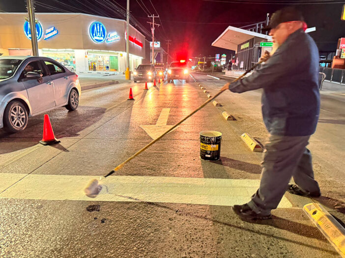 Durante la noche, trabajadores municipales se están dedicando al pintado de flechas, líneas de frenado, paso peatonal y otros señalamientos viales en distintas calles y avenidas de la ciudad, dio a conocer personal de Control de Tráfico de la Coordinación General de Seguridad Vial (CGSV).