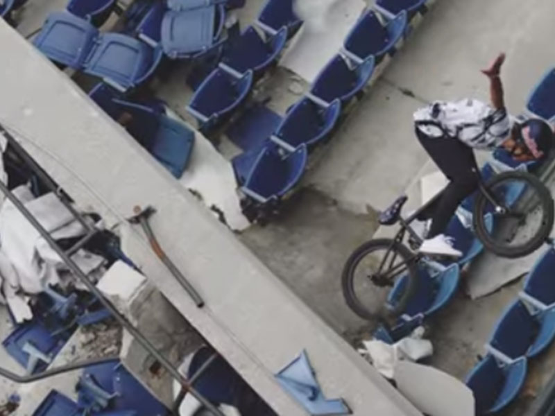 El estadio que fue sede de los Detroit Lions de la National Football desde 1975 hasta 2001, luce ahora completamente destrozado mientras el ciclista Fernengel realiza sus impresionantes acrobacias