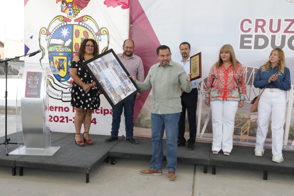 Durante el evento, el edil recibió un reconocimiento de parte de la comunidad escolar, así como una composición de fotografías para que recuerde que sus acciones están cambiando la vida de muchos jóvenes juarenses.