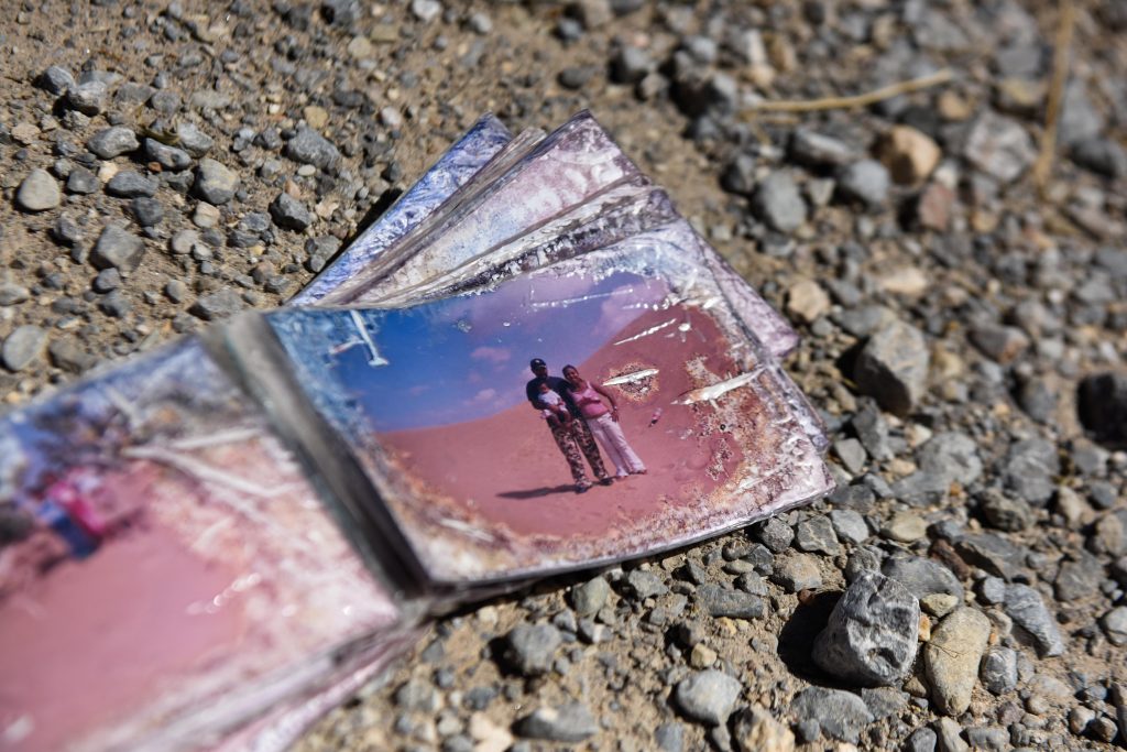La imagen de una pareja con un niño en brazos mientras están parados sobre la arena, probablemente junto al mar, forma parte de un álbum de fotografías que quedó tirado en el río Bravo en esta frontera entre Juárez y El Paso.