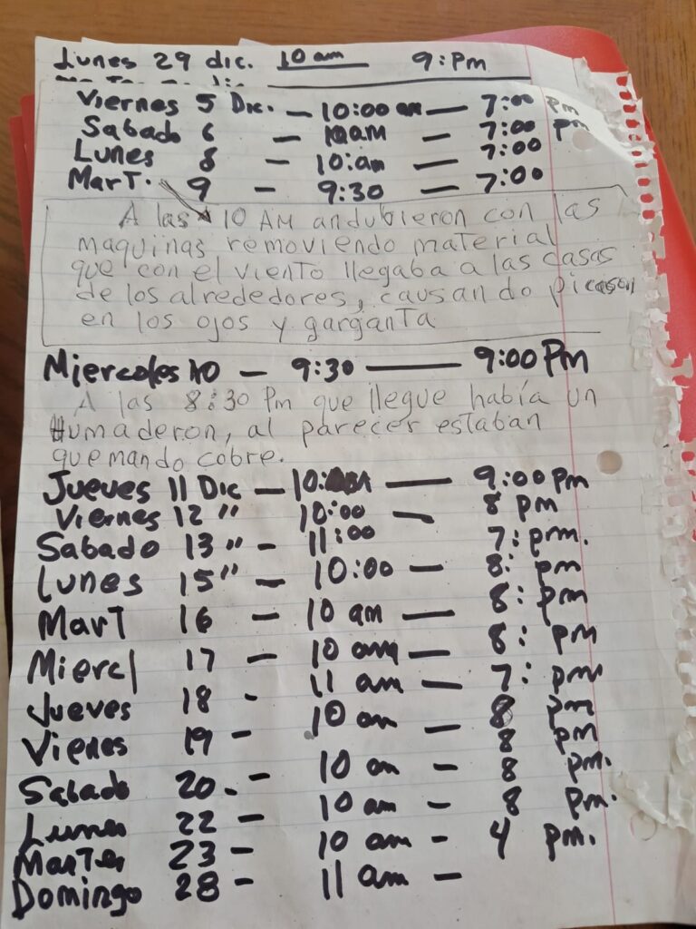 Para sustentar sus señalamientos, los vecinos presentaron videos, fotografías y una bitácora con fechas y horarios que, aseguran, evidencian que la quema de residuos —presuntamente para la extracción de cobre— no ha cesado.