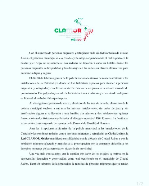 La Red Clamor México manifestó su solidaridad con la Diócesis de Juárez y con la población migrante afectada, además de que expuso su preocupación a la constante violación a los derechos humanos de las personas en situación de movilidad.