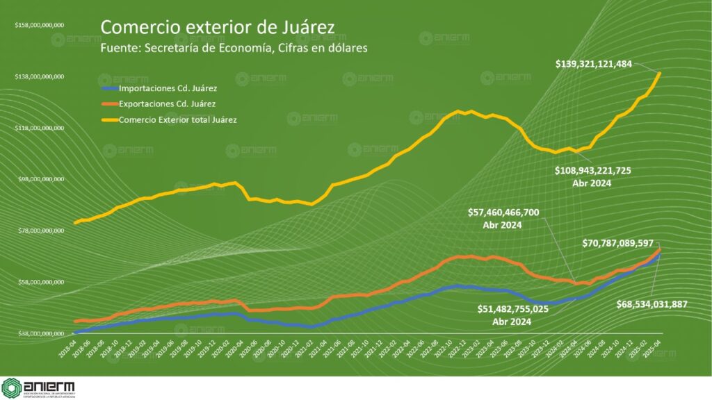 En las cifras anuales, en los últimos 12 meses contados hasta abril, dicho reporte señala que Juárez importó 68 mil 534 millones de dólares y exportó 70 mil 787 millones de dólares.