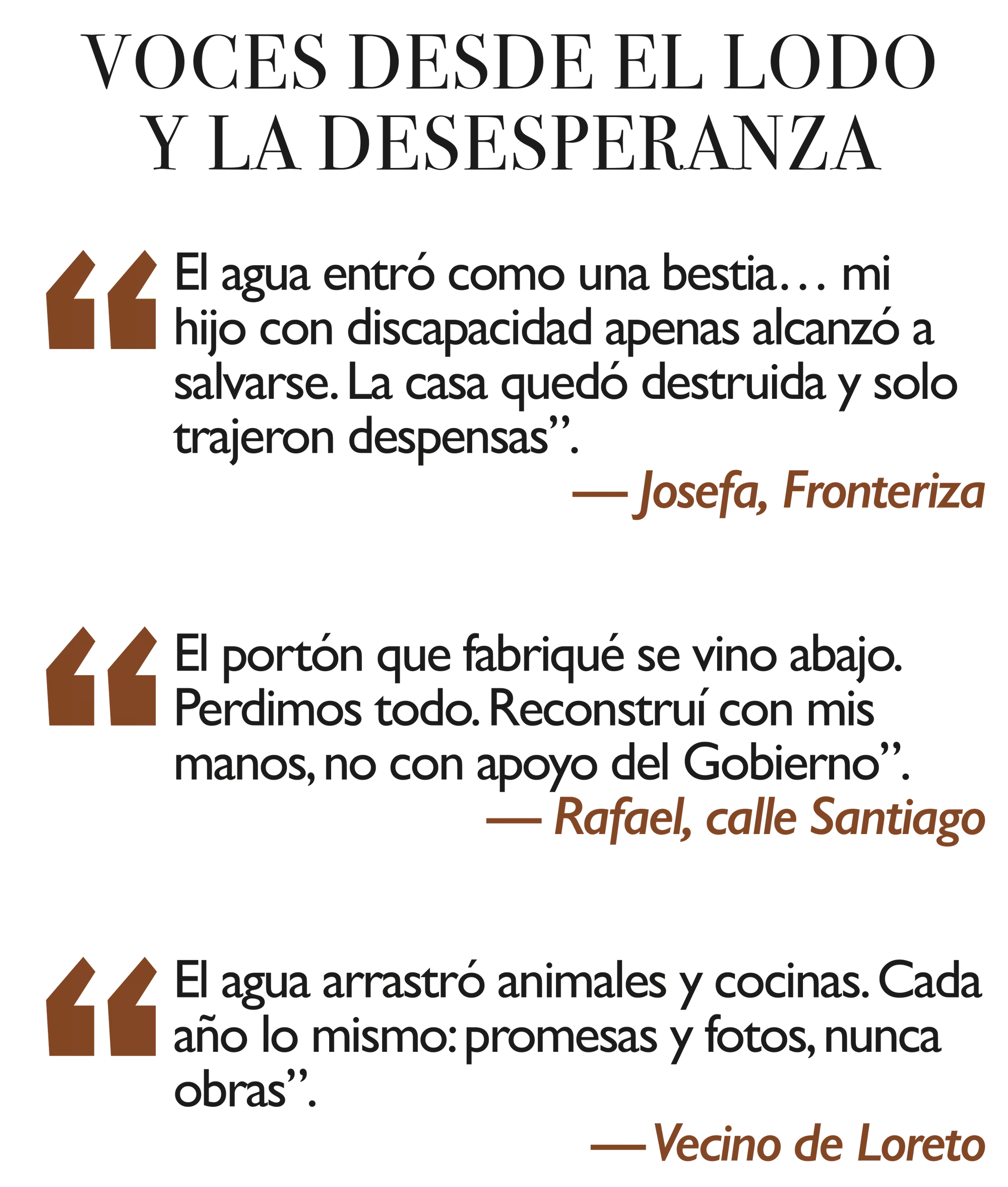 En la misma calle Loreto, los vecinos cuentan que el agua arrastró animales de granja, destruyó cocinas y obligó a varias familias a refugiarse en las azoteas. “Cada año es lo mismo, cada año promesas. Aquí lo que se necesita es cemento, no fotos”, dice un padre de familia.