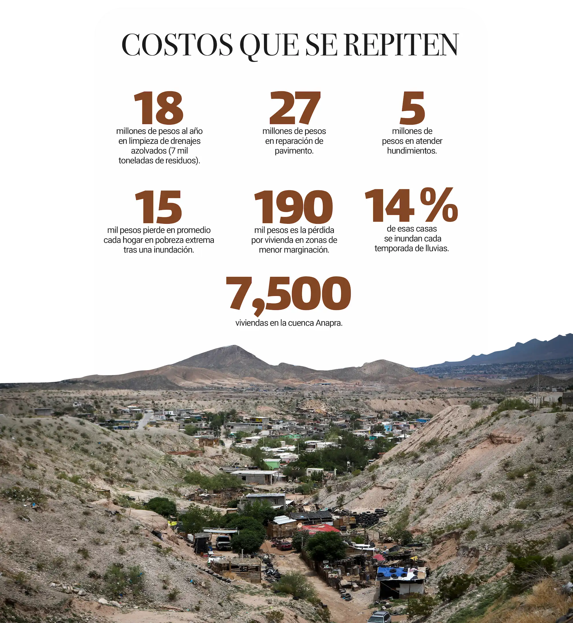 La cuenca Anapra, que concentra más de 7 mil 500 viviendas, se inunda todos los años. El 14 por ciento de sus casas resulta afectado en cada temporada de lluvias.