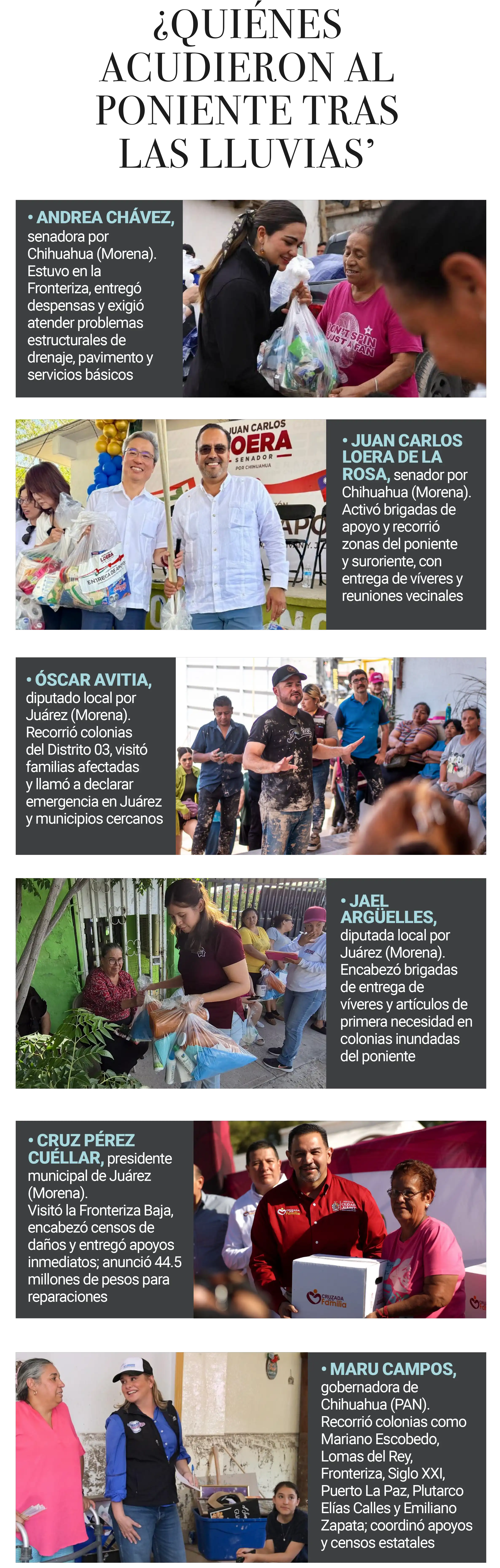 La gobernadora Maru Campos también se presentó en la zona afectada. Recorrió colonias como Mariano Escobedo, Lomas del Rey, Fronteriza, Siglo XXI, Puerto La Paz, Plutarco Elías Calles y Emiliano Zapata, entregó apoyos a familias damnificadas y afirmó que obras realizadas por su administración evitaron daños mayores. Su visita, sin embargo, fue percibida por muchos vecinos como parte del desfile político de la emergencia.
