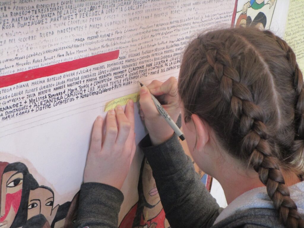 Muchos de ellos fueron invitados a escribir nombres en los muros del patio, donde Betty y Peter llevaban un registro de personas asesinadas en Juárez y en otras zonas de conflicto de América Latina, como un acto de memoria frente al olvido.