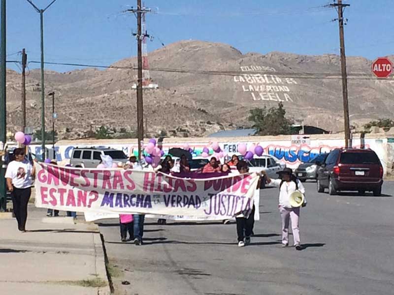 Con globos rosas y morados, madres de mujeres desaparecidas y asesinadas recorrieron el centro de Ciudad Juárez, hasta llegar a la Fiscalía de Género, donde recordaron que sus hijas no han sido encontradas
