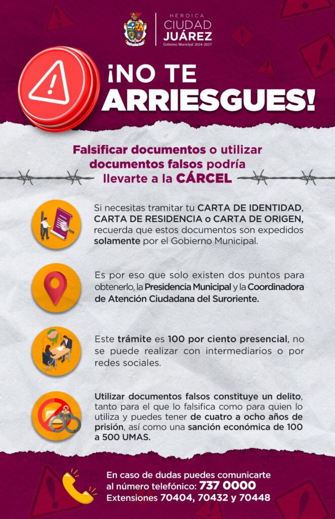 Dijo que la única forma válida de tramitar una carta de identidad, residencia o de origen es a través de las oficinas ubicadas en la planta baja de la Unidad Administrativa Licenciado Benito Juárez (Presidencia Municipal), o bien, en la Coordinación de Atención Ciudadana del Suroriente ubicadas en avenida Del Valle, en la colonia Zaragoza.