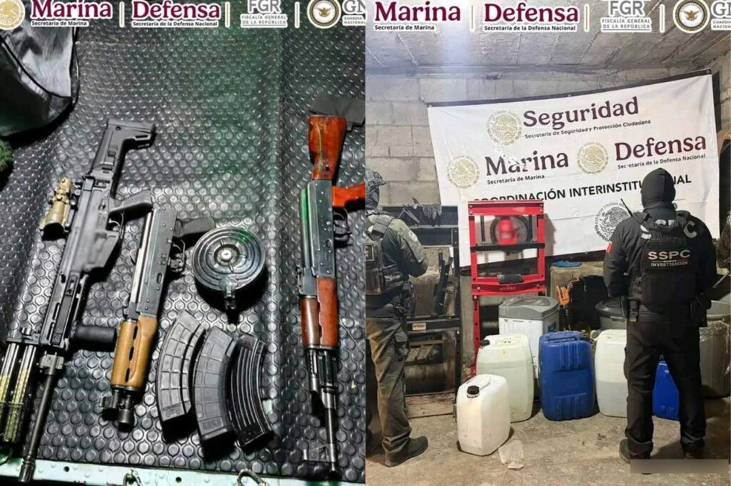 El remate del operativo vino con reconocimiento aéreo y terrestre cerca de El Dorado: localizaron un laboratorio clandestino que ya estaba en funcionamiento. Ahí aseguraron dos máquinas para hacer tabletas, ollas de peltre, contenedores y más de 500 litros de sustancias químicas clave para cocinar drogas sintéticas.