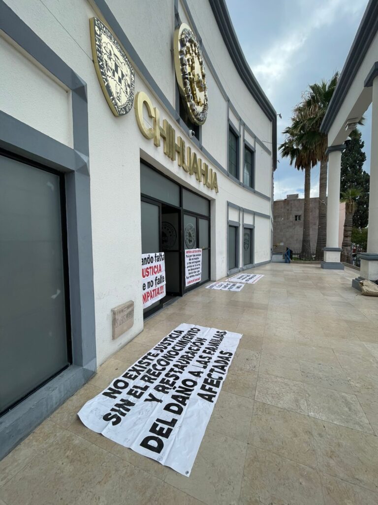 Acompañados con pancartas que colocaron en la entrada del edificio gubernamental, los protestantes viajaron desde esta frontera para manifestar la necesidad de una actuación rápida en este caso que conmocionó al estado.