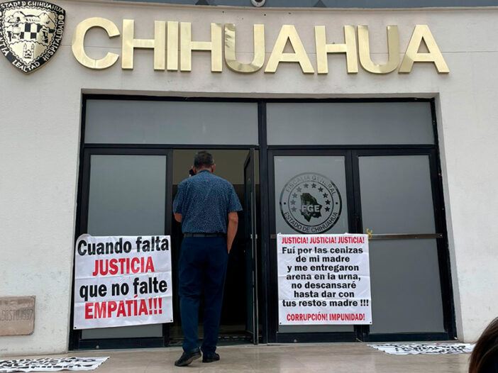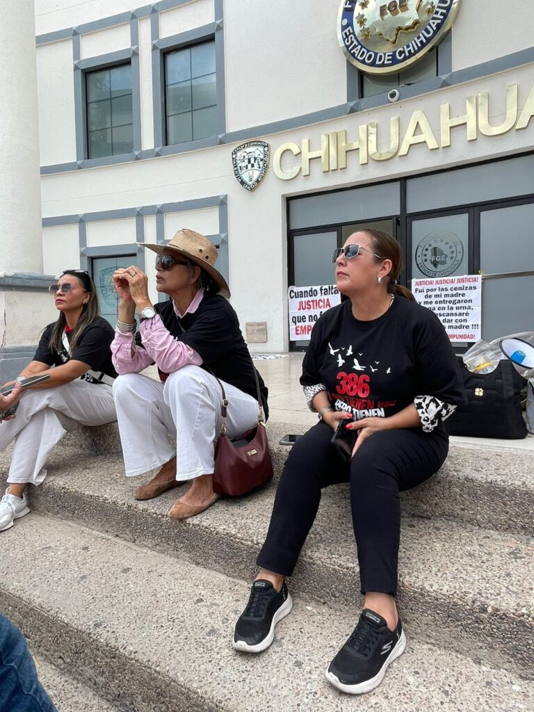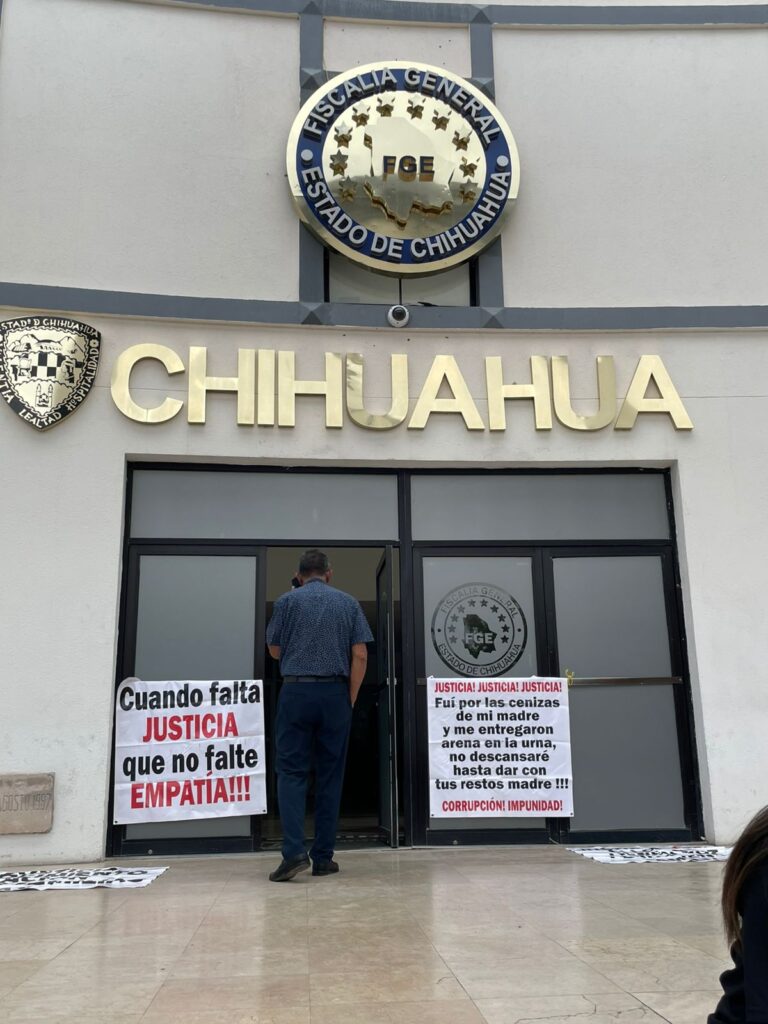 Esta mañana, un grupo de manifestantes del colectivo Justicia por nuestros deudos se presentó en las afueras de la Fiscalía General del Estado (FGE), en la ciudad de Chihuahua, para exigir celeridad en la identificación de los 386 cadáveres encontrados en el crematorio Plenitud.