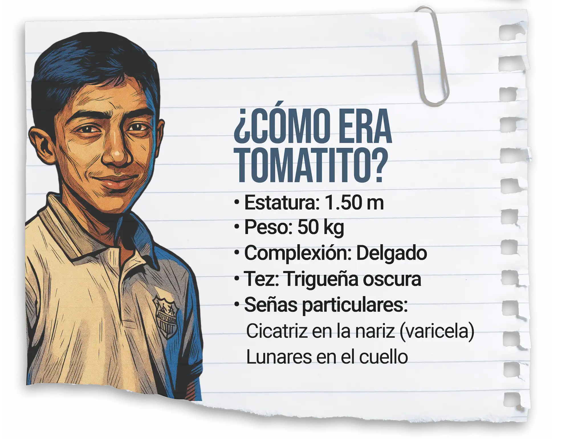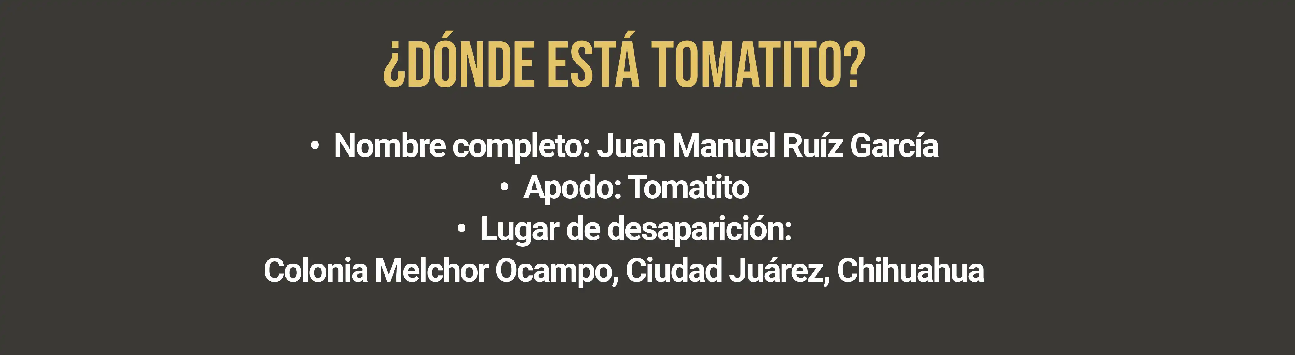 Tomatito desapareció en la calle 9 de Agosto, número 2032, en la colonia Melchor Ocampo, en Ciudad Juárez. En ese entonces medía 1.50 metros y pesaba 50 kilos, se indica en su pesquisa, donde se le describe como un niño de tez trigueña oscura, delgado y, como señas particulares, una cicatriz en la nariz por varicela y lunares en el cuello.