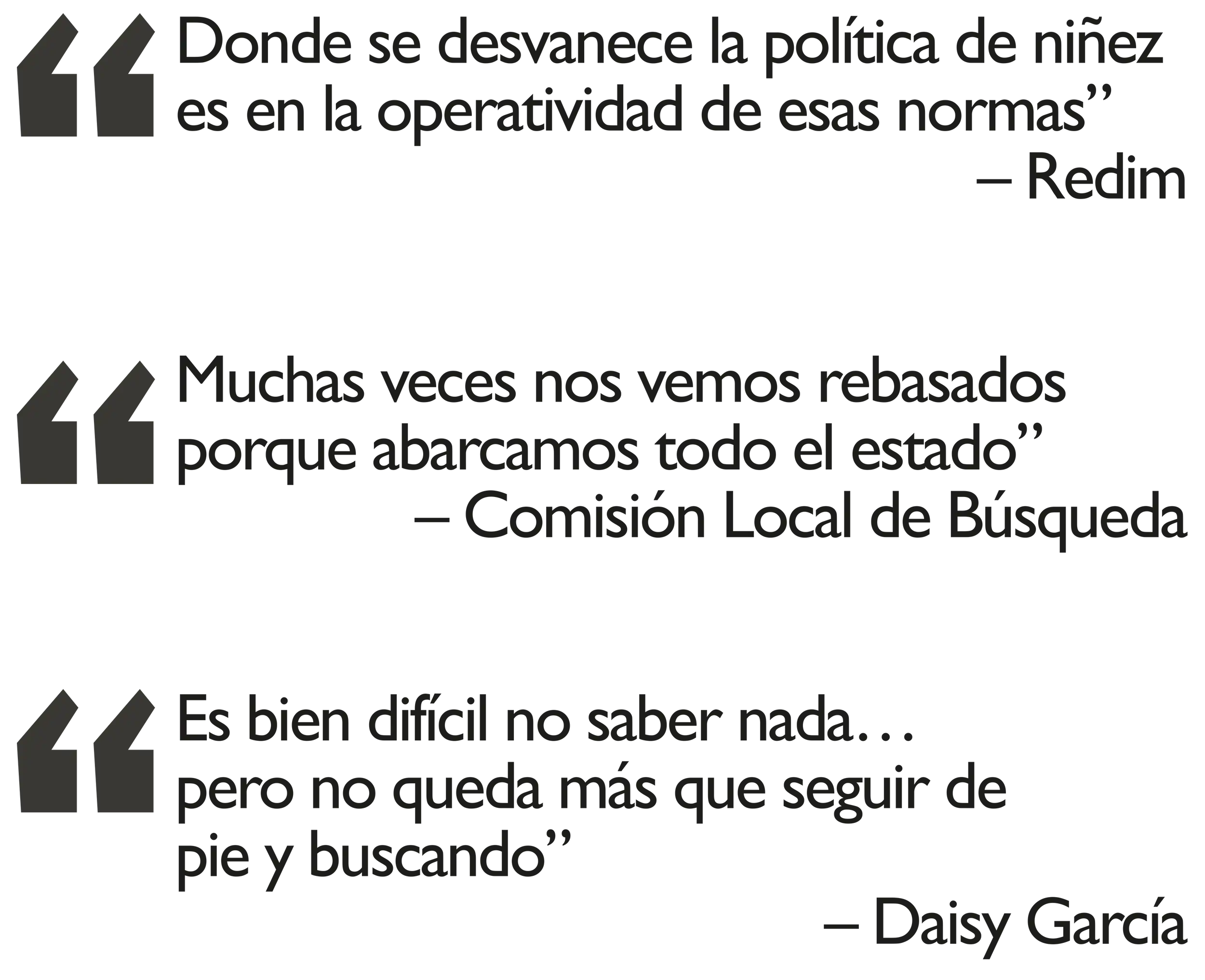 Sobre estas fallas, la abogada Carla Palacios, del CDHPN, detalla que otro gran problema es que los Gobiernos no cuentan con una instancia específica que atienda los asuntos de los menores de edad en calidad de desaparecidos.