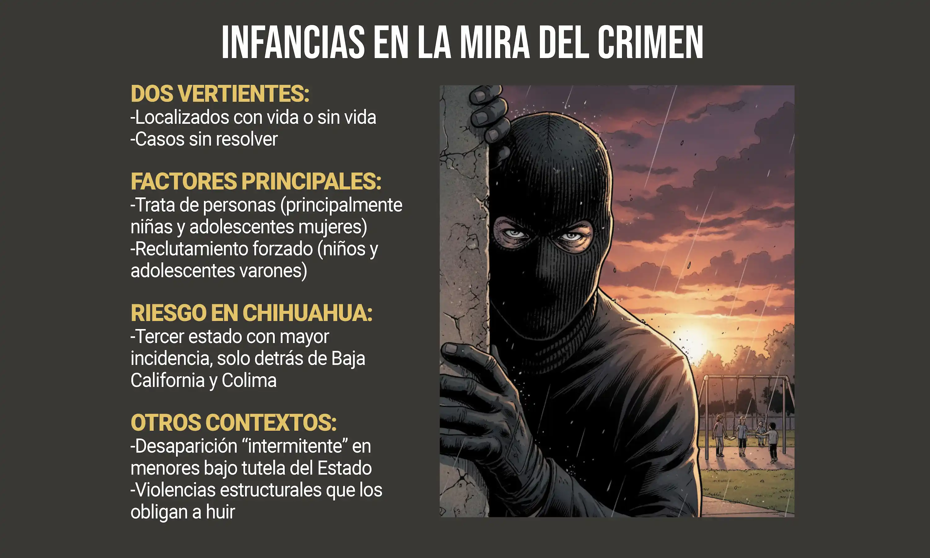 El Mecanismo Estratégico del Reclutamiento y Utilización de NNA por Grupos Delictivos y la Delincuencia Organizada en Zonas de Alta Incidencia Delictiva en México, documento realizado por la Secretaría de Gobernación, coloca a Chihuahua como el tercer estado con mayor riesgo de que un menor de edad sea desaparecido por la delincuencia, por debajo de Baja California y Colima, y por encima de Ciudad de México y Estado de México.